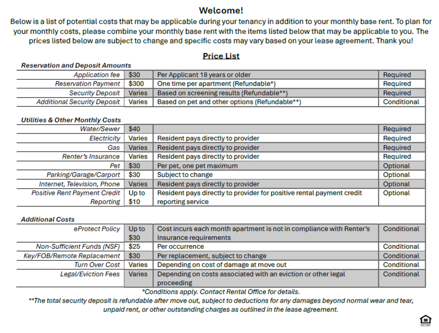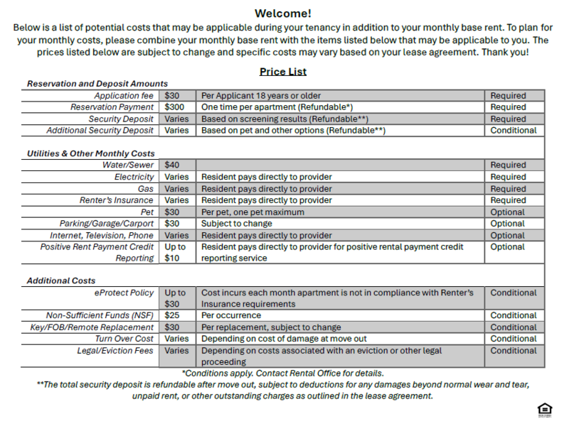 Price shown is Base Rent. Residents are required to pay the following: Application Fee ($30.00 Per Applicant 18 years or older, One-Time, At Application), Reservation Payment ($300, One time per apartment, Refundable*), Security Deposit (Varies, Based on screening results, Per Apartment, Refundable**), Additional Security Deposit (Varies, Based on pet and other options, Refundable**, Water/Sewer (Up to $55 per month per apartment, Utility, Usage Based, Nonrefundable), Recycling ($2 per month per apartment, if applicable, Nonrefundable), Electricity/Gas (Varies, Usage Based, Utility, Resident pays directly to provider), Renter’s Insurance (Varies, Resident pays directly to provider). Optional charges that may be applicable to the resident are as follows: Pet ($30 Per pet per month, Up to two pets maximum, Nonrefundable), Parking/Carport/Garage/Storage (Varies per property, per month, Subject to change, Nonrefundable, Refundable** deposit may apply), Internet, TV, Phone (Varies, Utility, Resident pays directly to provider), eProtect Policy (Up to $30, Cost incurs each month apartment is not in compliance with Renter’s Insurance requirements, Nonrefundable), Non-Sufficient Funds (NSF) ($25 Per occurrence, Nonrefundable) Key/FOB/Remote Replacement (Varies per property, Per replacement, Subject to change, Nonrefundable), Positive Rental Payment Credit Reporting ($2.00 per month per resident, Resident pays directly to CredHub, Nonrefundable), Turn Over Cost (Varies, Depending on cost of damage at move out), Legal/Eviction Fees (Varies, Depending on costs associated with an eviction or other legal proceeding). *Conditions apply. Contact Rental Office for details. **The total security deposit is refundable after move out, subject to deductions for any damages beyond normal wear and tear, unpaid rent, or other outstanding charges as outlined in the lease agreement.